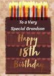 Gezellige verjaardagskaart met een taart en kaarsjes. Op de kaart staat: To a very special grandson Happy 18th birthday