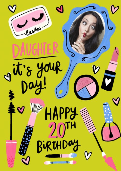 Leuke kaart met allemaal make-up en de tekst: Daughter it's your day, Happy 20th birthday.