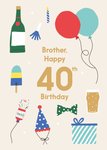 Vrolijke verjaardagskaart met ballonnen, champagne en confetti. Op de kaart staat: Brother, happy 40th birthday.