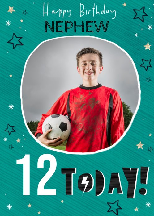 Stoere kaart voor een jarig neefje met foto en de tekst: Happy birthday nephew 12 today!
