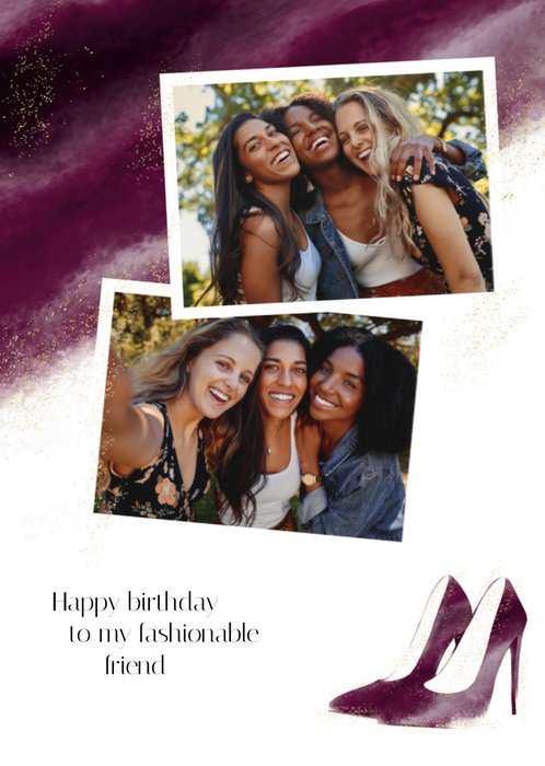 Wens een vriendin een fijne verjaardag toe met deze stijlvolle verjaardagskaart met pumps erop en de tekst: Happy birthday to my fashionable friend. Je kunt twee eigen foto's toevoegen.