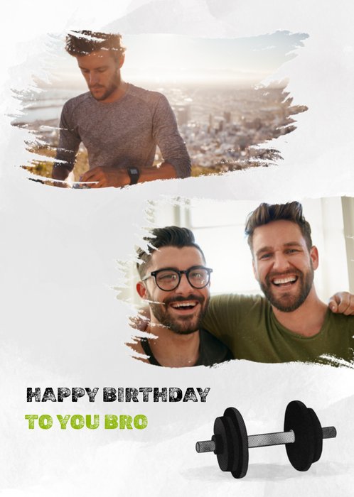 Wens een vriend een fijne verjaardag toe met deze verjaardagskaart met de tekst: Happy birthday to you my bro. Voeg twee eigen foto's toe op de kaart.