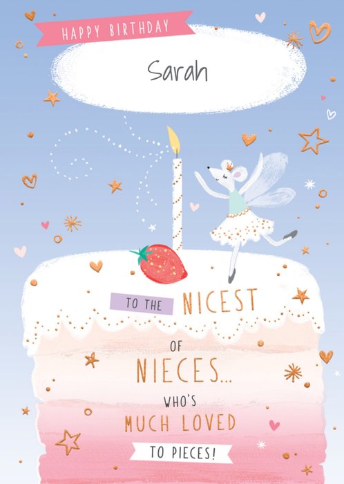 Lieve kaart met een kat en ballonnen. Op de kaart staat: Happy birthday to a wonderful niece.
