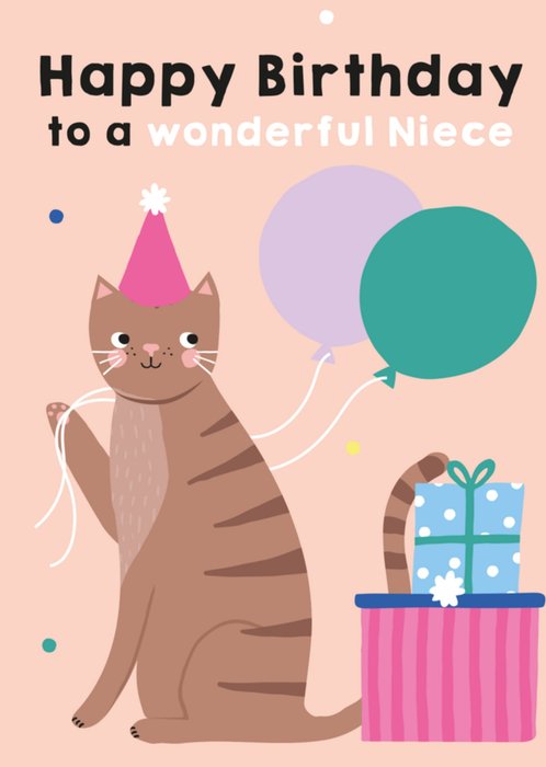 Lieve kaart met een kat en ballonnen. Op de kaart staat: Happy birthday to a wonderful niece.