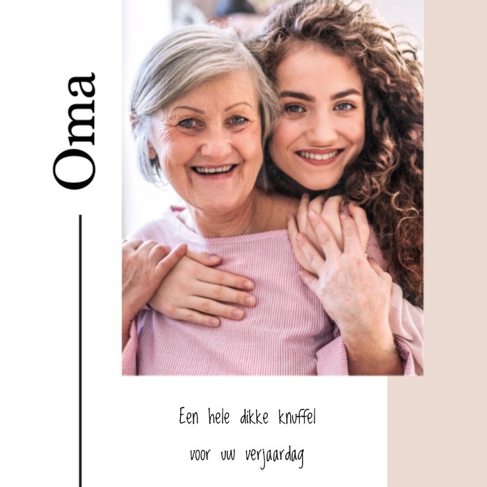 Wens je oma een fijne verjaardag toe met deze leuke verjaardagskaart met de tekst: Oma een hele dikke knuffel voor uw verjaardag. Voeg je eigen foto toe.