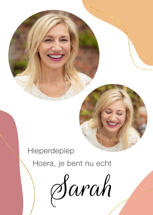 Wens een Sarah een fijne 50ste verjaardag toe met deze verjaardagskaart met de tekst: Hieperdepiep Hoera, je bent nu echt Sarah. Voeg twee eigen foto's toe.