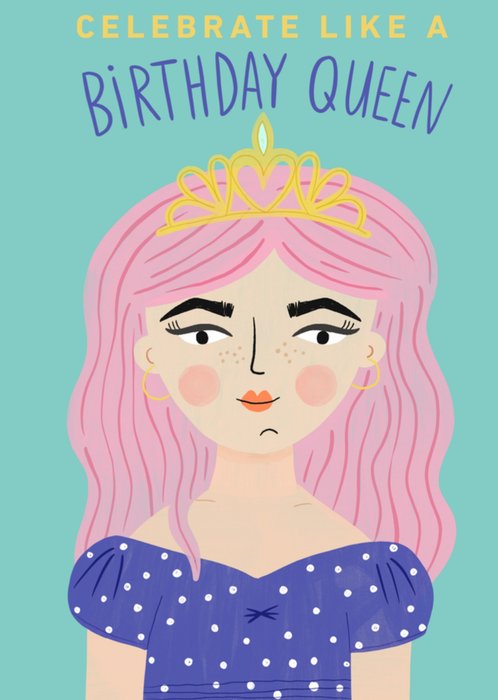 Leuke verjaardagskaart met illustratie en de tekst: Celebrate like a birthday queen.