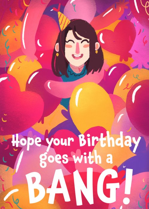 Verjaardagskaart met illustratie en de tekst: Hope your birthday goes with a bang!