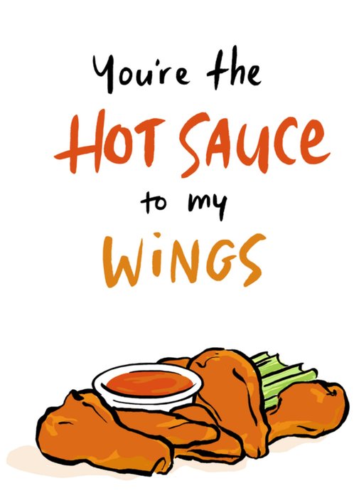 Grappige illustratie met de tekst: You're the hot sauce to my wings.  Wenskaart van Greetz ontworpen door Greetz designers, volgens de laatste trends. Voeg je eigen foto('s), tekst, & versiering toe om de kaart extra persoonlijk te maken. Je kunt de kaart toevoegen aan je favorieten of tussentijds opslaan om deze later af te maken. Meer Valentijnskaarten zien? Check ze hier.