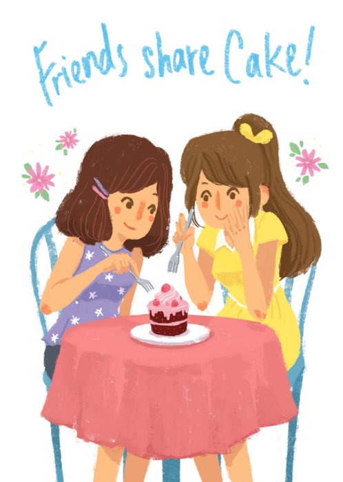 Leuke verjaardagskaart met illustratie en de tekst: Friends share cake!