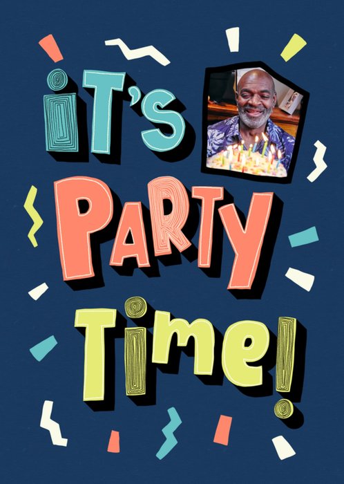 Kleurrijke verjaardagskaart met aanpasbare foto en de tekst: 'It's party time!'. Verras iemand met deze typografische verjaardagskaart.