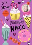 Leuke paarse kaart met geïllustreerde zoetwaren en de tekst: It's your 10th birthday niece.