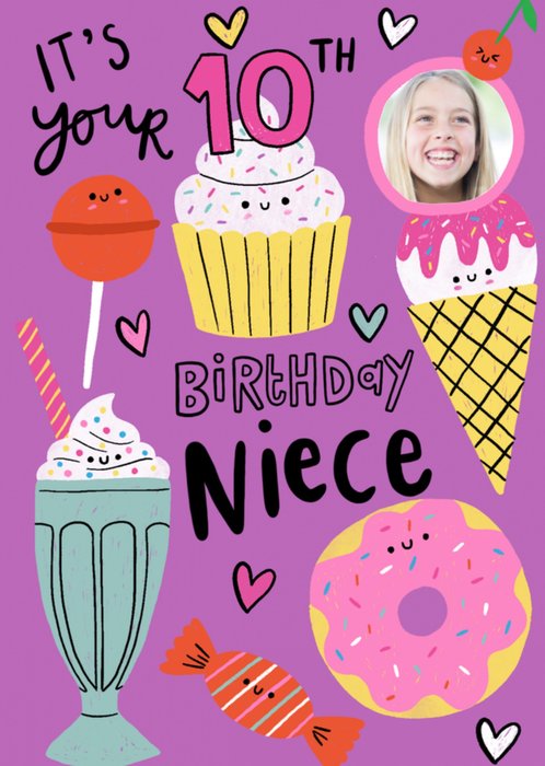 Leuke paarse kaart met geïllustreerde zoetwaren en de tekst: It's your 10th birthday niece.