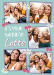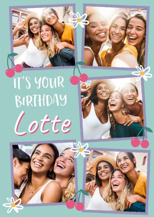 Kleurrijke verjaardagskaart met kersen, bloemen, aanpasbare fotos en de tekst: 'It's your birthday'. Verras iemand met deze leuke verjaardagskaart van Moonpig.