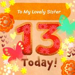 Lieve kaart voor een jarige zus die 13 jaar is geworden. Op de kaart staat: To my lovely sister, 13 today! De tekst is aanpasbaar.