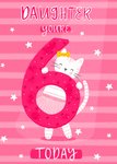 Lieve verjaardagskaart met een kat die het cijfer 6 vasthoudt op de kaart staat: Daughter you're 6 today.