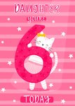 Lieve verjaardagskaart met een kat die het cijfer 6 vasthoudt op de kaart staat: Daughter you're 6 today.