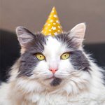 Leuke verjaardagskaart met een kat en een feesthoedje.