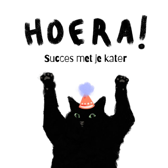Illustratieve verjaardagskaart met een kat en de tekst: 'Hoera! Succes met je kater'. Verras iemand met deze grappige verjaardagskaart van Greetz.