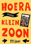 Typografische verjaardagskaart met aanpasbare foto en de tekst: 'Hoera onze kleinzoon'. Verras je kleinzoon met deze kleurrijke verjaardagskaart van Greetz.