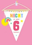Kleurrijke verjaardagskaart voor een jarig nichtje. Op de kaart staat: Nicht je bent 6 vandaag!