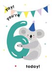 Schattige verjaardagskaart met een koala die het cijfer 6 vastheeft. Op de kaart staat: Yay! You're 6 today!