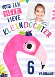 Leuke verjaardagskaart met een grote flamingo en de tekst: Voor een hele lieve kleindochter 6 vandaag!