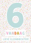 Kleurrijke verjaardagskaart met een grote zes op de kaart. De tekst op de kaart is: 6 vandaag lieve kleindochter!