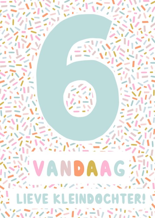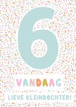 Kleurrijke verjaardagskaart met een grote zes op de kaart. De tekst op de kaart is: 6 vandaag lieve kleindochter!