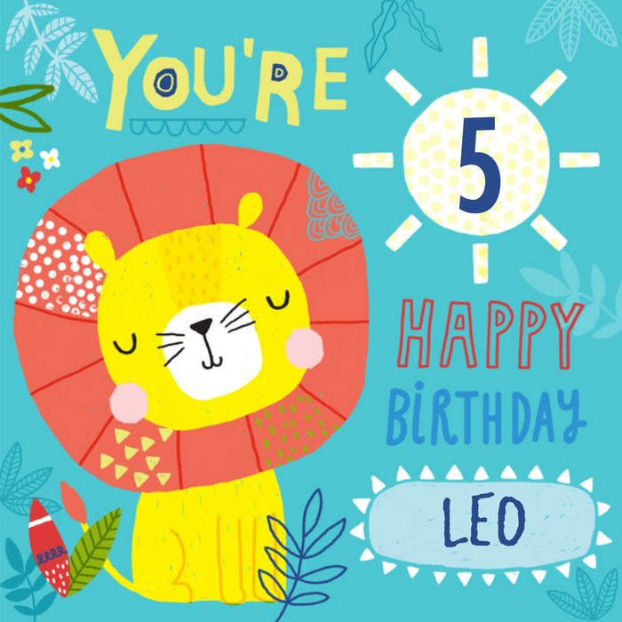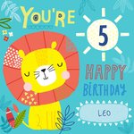Lieve kaart met een leeuw en de tekst: You're 5 happy birthday Leo. De naam is aanpasbaar.