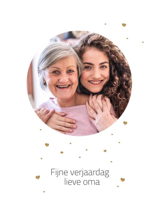 Feliciteer je lieve oma voor haar verjaardag met deze te schattige verjaardagskaart. Op de kaart staat de tekst: Fijne verjaardag lieve oma. Voeg je eigen foto toe.
