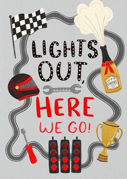 Een energieke motorsportkaart met een racebaan, geblokte vlag, champagnefles, winnaarstrofee en een racehelm. Met de opvallende zin "Lights Out, Here We Go!" is deze kaart perfect voor Formule 1-fans en raceliefhebbers. Een geweldige keuze voor verjaardagen, vieringen en motiverende momenten!