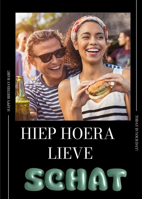 Typografische verjaardagskaart met aanpasbare foto en de tekst: 'Happy birthday babe! Today is your day. SCHAT'. Verras iemand met deze leuke verjaardagskaart met aanpasbare tekst van Greetz.