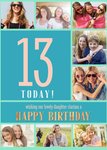 Mooie verjaardagskaart met de mogelijkheid om verschillende eigen foto's toe te voegen. Op de kaart staat: 13 today! Wishing our lovely daughter Clarissa a happy birthday. De naam op de kaart is aanpasbaar.