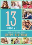 Mooie verjaardagskaart met de mogelijkheid om verschillende eigen foto's toe te voegen. Op de kaart staat: 13 today! Wishing our lovely daughter Clarissa a happy birthday. De naam op de kaart is aanpasbaar.
