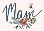 Fleurige verjaardagskaart met bloemetjes en bijtjes. Op de kaart staat: mam