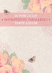 Mooie kaart met bloemen en vlinders en de tekst: Ik wens je een fantastische verjaardag tante Louise. De naam is aanpasbaar.