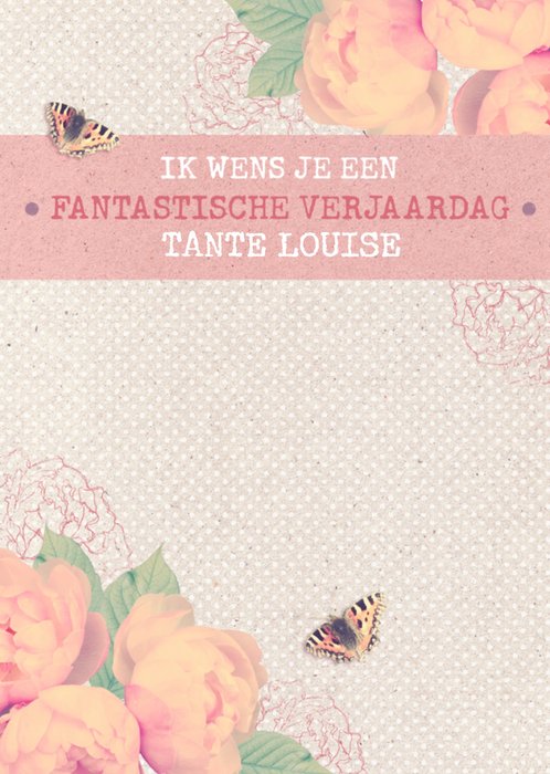 Mooie kaart met bloemen en vlinders en de tekst: Ik wens je een fantastische verjaardag tante Louise. De naam is aanpasbaar.