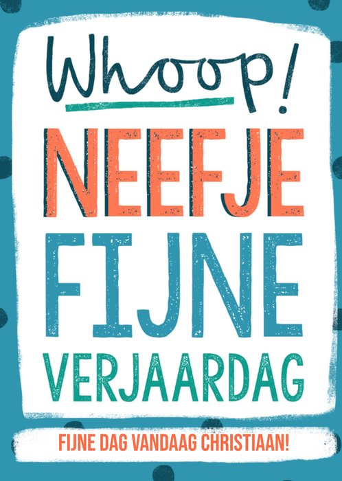 Op deze kaart staat: 'Whoop! Neefje fijne verjaardag, fijne verjaardag Christiaan!' De naam is aanpasbaar.