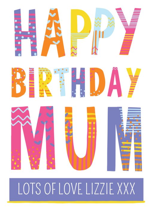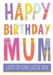 Vrolijke verjaardagskaart voor een lieve moeder met de tekst: Happy birthday mum lots of love Lizzie xxx. De naam is aanpasbaar.