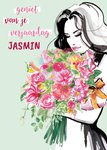 Fleurige verjaardagskaart met de tekst: Geiet van je verjaardag Jasmin. De naam is aanpasbaar.