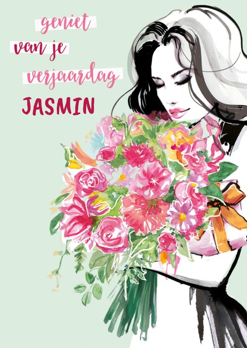 Fleurige verjaardagskaart met de tekst: Geiet van je verjaardag Jasmin. De naam is aanpasbaar.