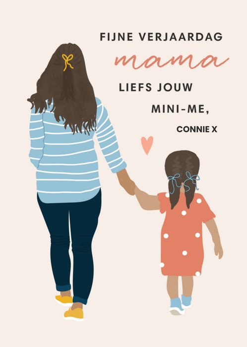 Lieve verjaardagskaart met aanpasbare naam en de tekst: Fijne verjaardag mama liefs jouw mini-me, Connie x