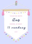 Leuke verjaardagskaart met de tekst: Voor de beste zus hoera je bent 15 vandaag Marit. De naam is aanpasbaar.
