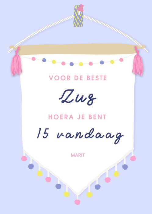 Leuke verjaardagskaart met de tekst: Voor de beste zus hoera je bent 15 vandaag Marit. De naam is aanpasbaar. Wenskaart van Greetz ontworpen door Greetz designers, volgens de laatste trends. Voeg je eigen foto('s), tekst, & versiering toe om de kaart extra persoonlijk te maken. Je kunt de kaart toevoegen aan je favorieten of tussentijds opslaan om deze later af te maken. Meer verjaardagskaarten zien? Check ze hier.