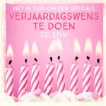 Roze verjaardagskaart met aanpasbare naam en de tekst: Het is tijd om een speciale verjaardagswens te doen Selena!