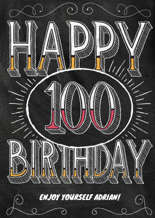 Verjaardagskaart met de tekst: Happy 100 birhday enjoy yourself Adrian! De naam is aanpasbaar.
