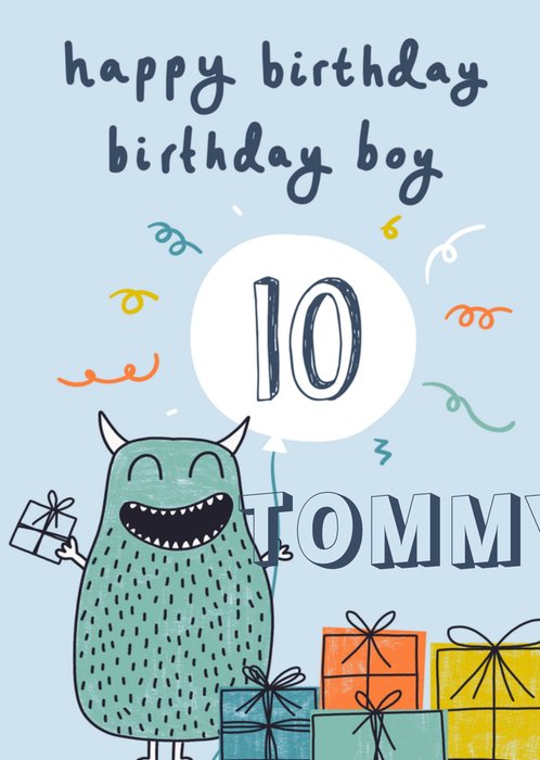 Monsterlijke verjaardagskaart met de tekst: Happy birthday, birthday boy 10 tommy. De naam is aanpasbaar.