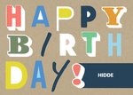Bruine verjaardagskaart met aanpasbare naam en de tekst: Happy birthday!