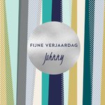Verjaardagskaart met verticale strepen en aanpasbare naam.